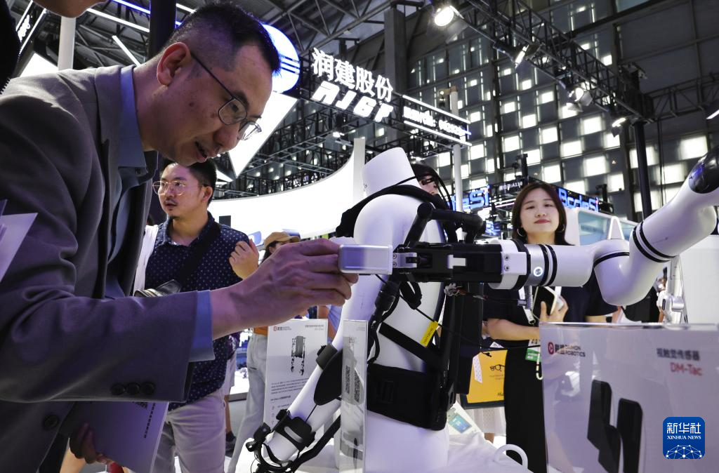 7月26日,参观者在体验触摸一款装备视触觉传感器的机器人。
