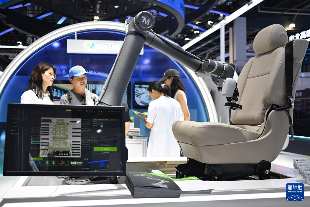 7月26日,观众在用于AI汽车座椅飞拍检测的达明机器人展品前驻足观看。