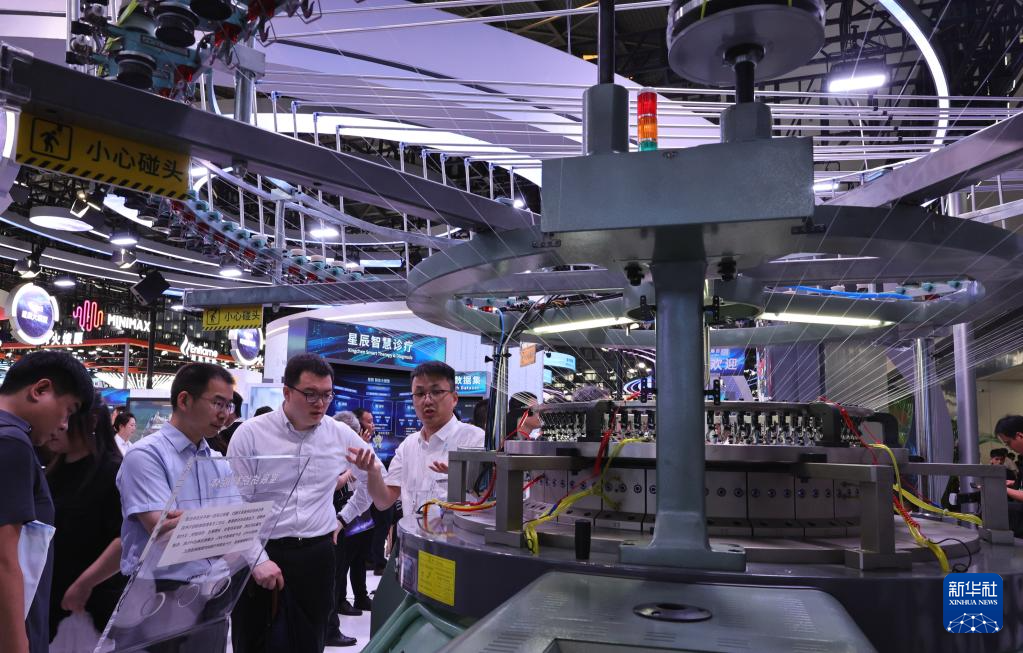 7月26日,参观者在一个依托大模型数据打造的星辰纺织智能体展品旁交流讨论。