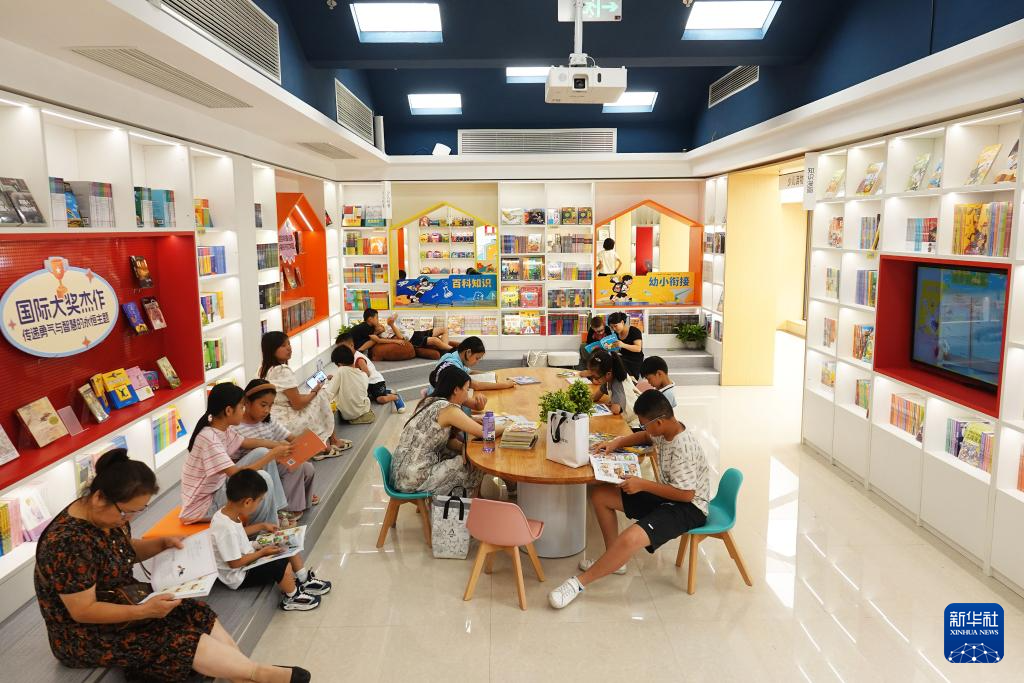 7月25日,小朋友们在河北省石家庄书城内读书。