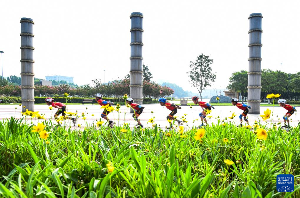7月26日,孩子们在河南省济源市世纪广场练习轮滑。