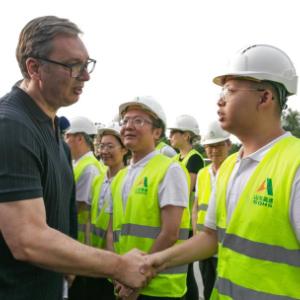 7月26日,塞尔维亚总统武契奇(前左)在戈卢巴茨视察“多瑙走廊”快速路项目时与中方工作人员握手。