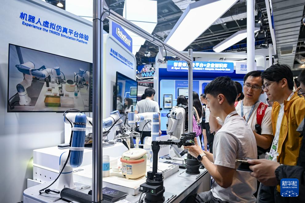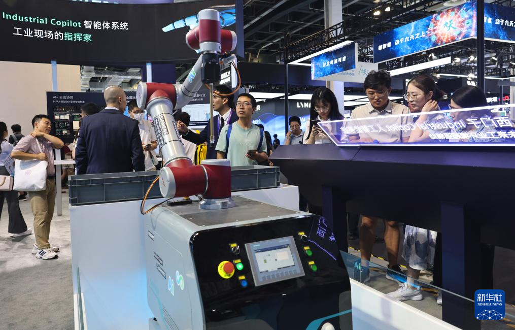 7月27日,参观者在一个工业智能体系统操作演示展台前驻足观看。