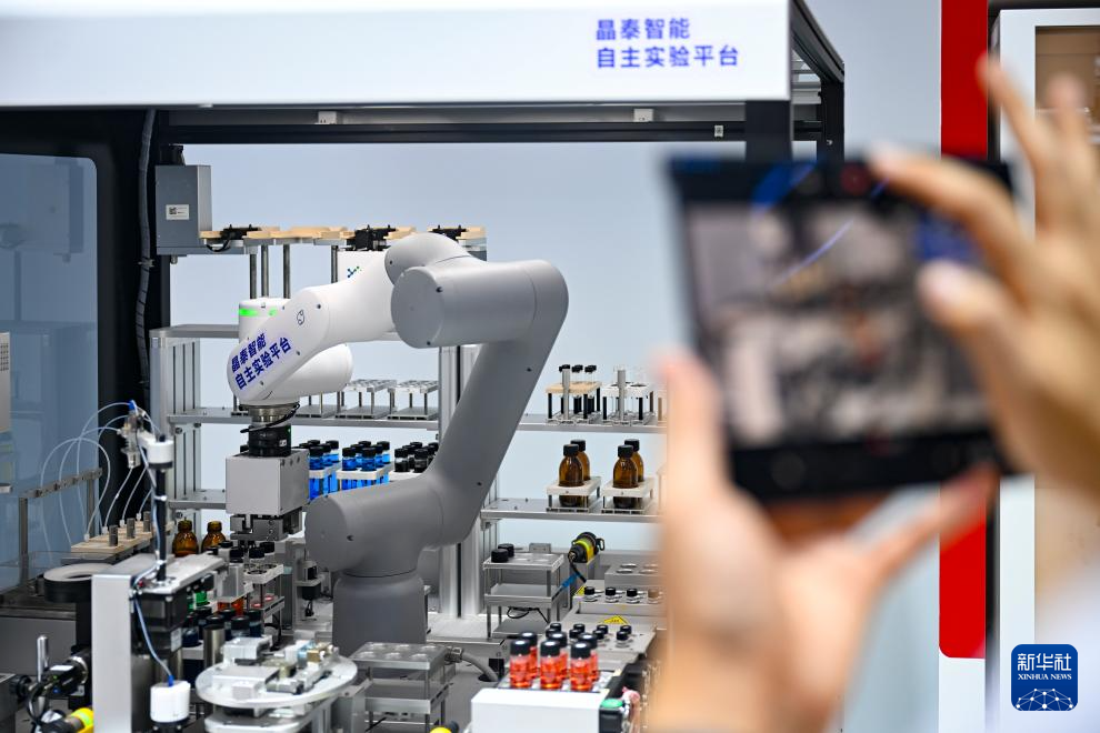 7月27日,参观者在拍摄展品——晶泰智能自主实验平台。