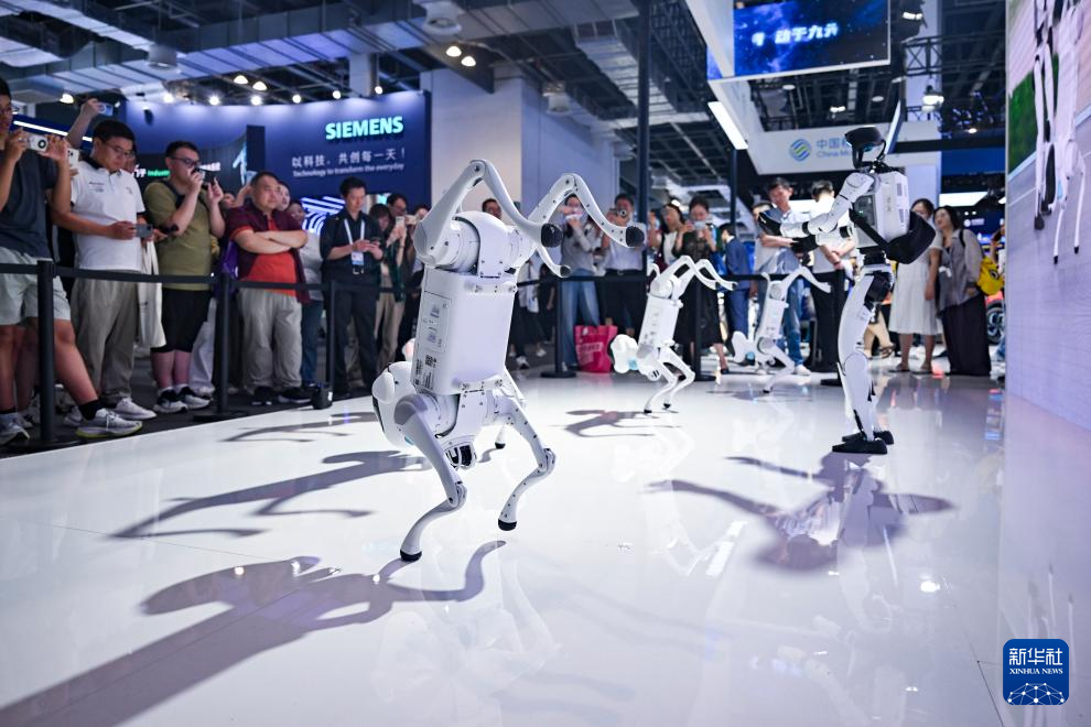7月27日,中国移动自研机器狗及机器人在进行舞蹈表演,吸引参观者驻足。