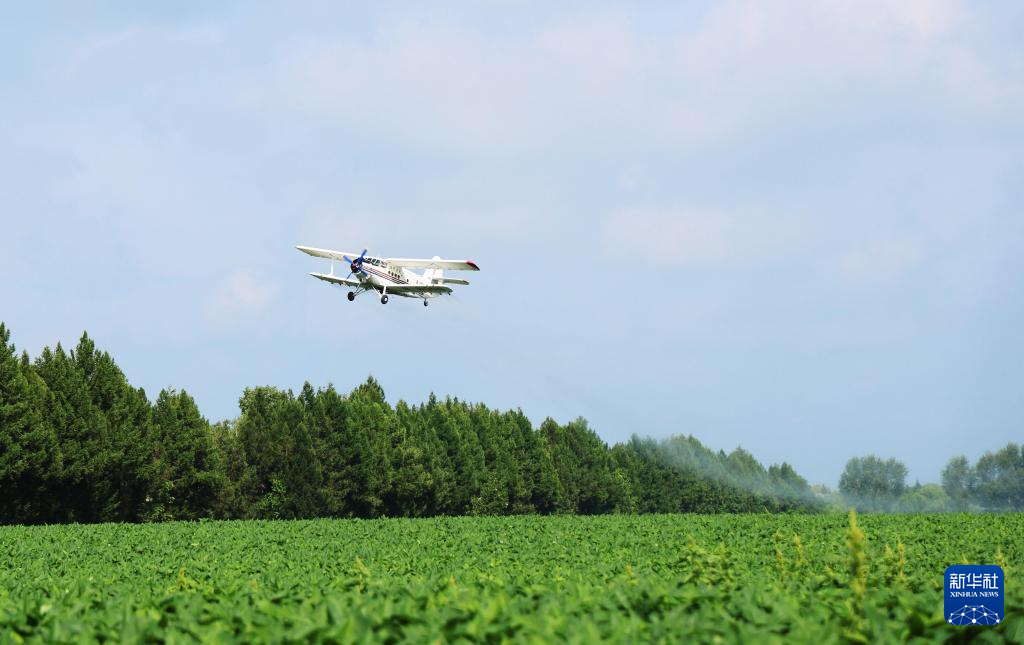 7月25日,在北大荒集团黑龙江红星农场第一管理区大豆地块,一架农用飞机在进行航化作业。