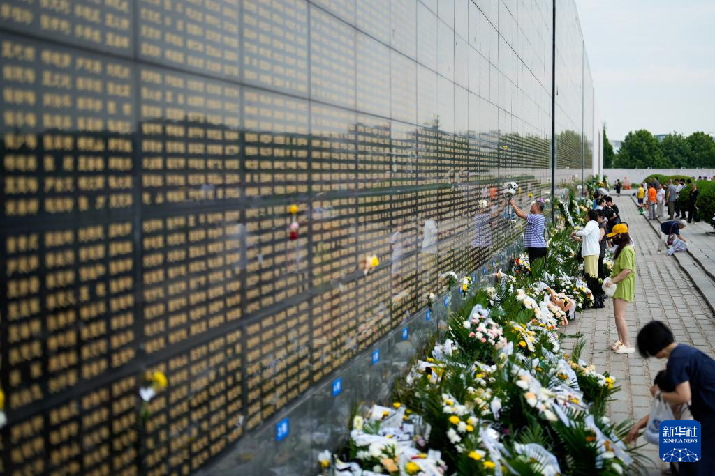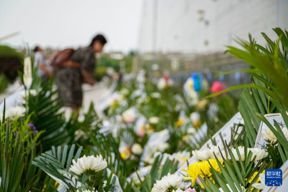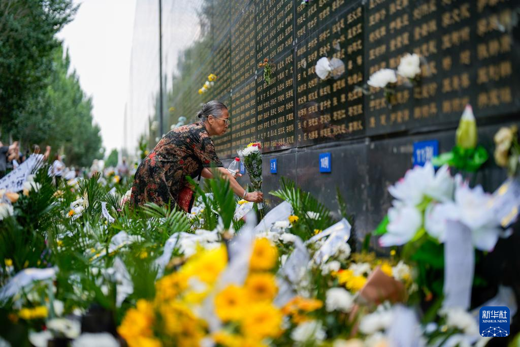 当日是唐山大地震49周年,市民来到河北唐山地震遗址纪念公园,在纪念墙前献上鲜花,缅怀地震罹难者。