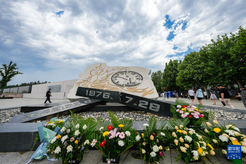 7月28日,唐山地震遗址纪念公园雕塑前摆满鲜花。