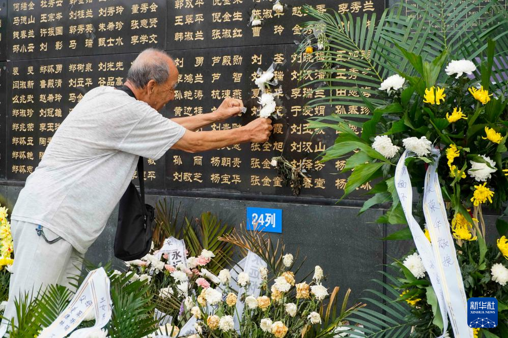 7月28日,市民在唐山地震遗址纪念公园的纪念墙前献花。
