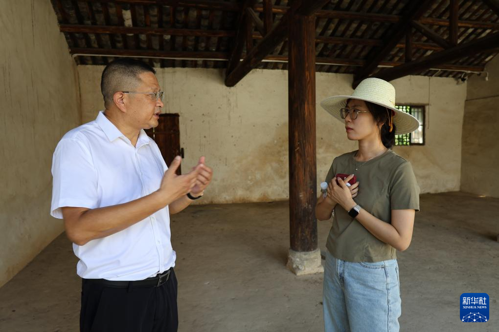 大悟县革命传统教育基地管理委员会副主任付波(左)在新四军第五师国际招待所内向记者讲述历史(7月21日摄)。