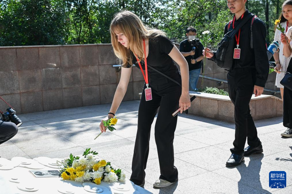 7月28日,在湖北省黄冈市红安县,学生们排队在飞虎队队员格伦·本尼达墓碑前献花。