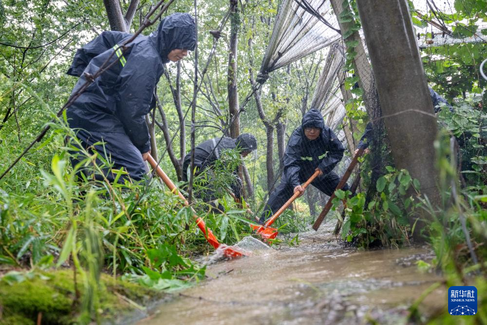 7月30日,在浙江省湖州市长兴县夹浦镇长平村一处葡萄基地,党员志愿者、民兵帮助农户排水通渠。