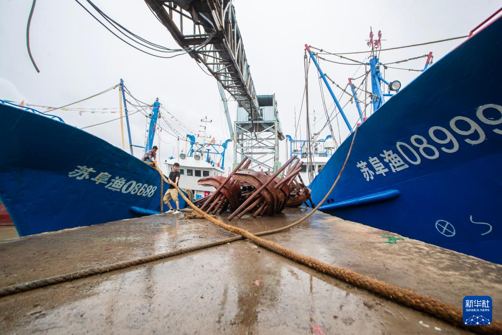 7月30日,在江苏省盐城市射阳县黄沙港码头,船员检查加固缆绳。