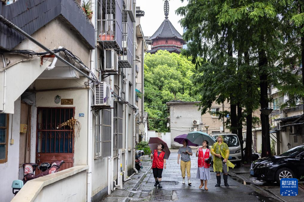 7月30日,在浙江省湖州市吴兴区飞英街道塔下街社区,工作人员巡查老旧小区,排除安全隐患。