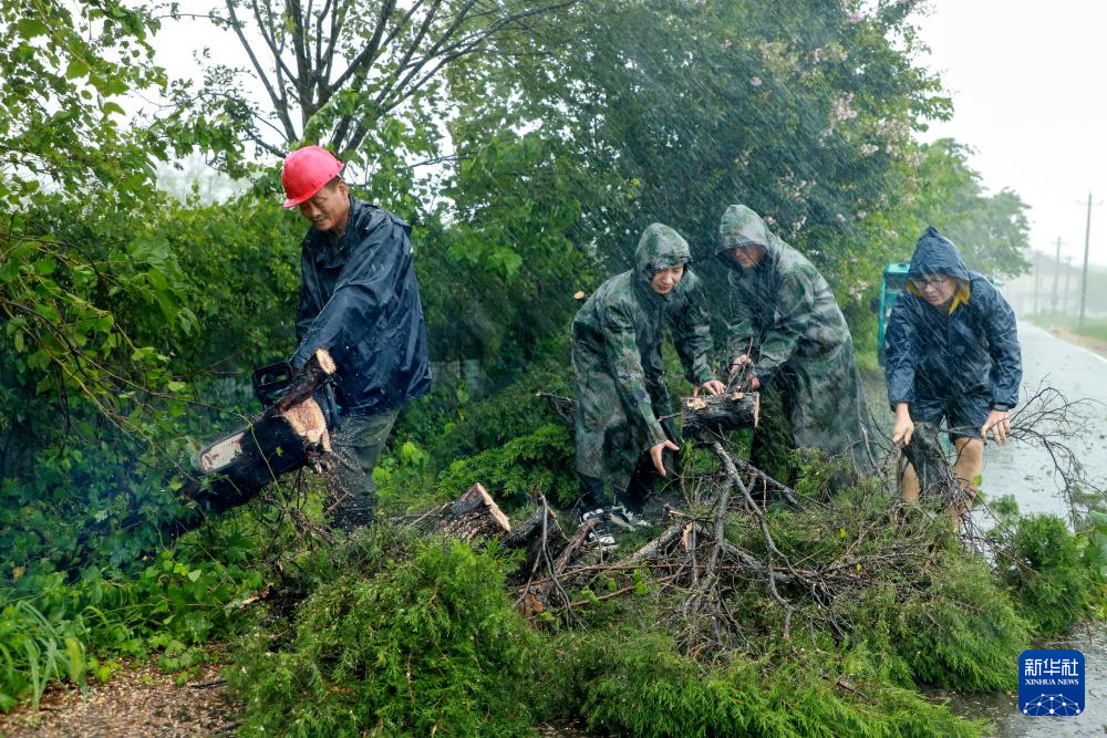 7月30日,在浙江省湖州市长兴县小浦镇中山村,村干部与青年党员一起清理倒伏的树木,保障道路畅通。