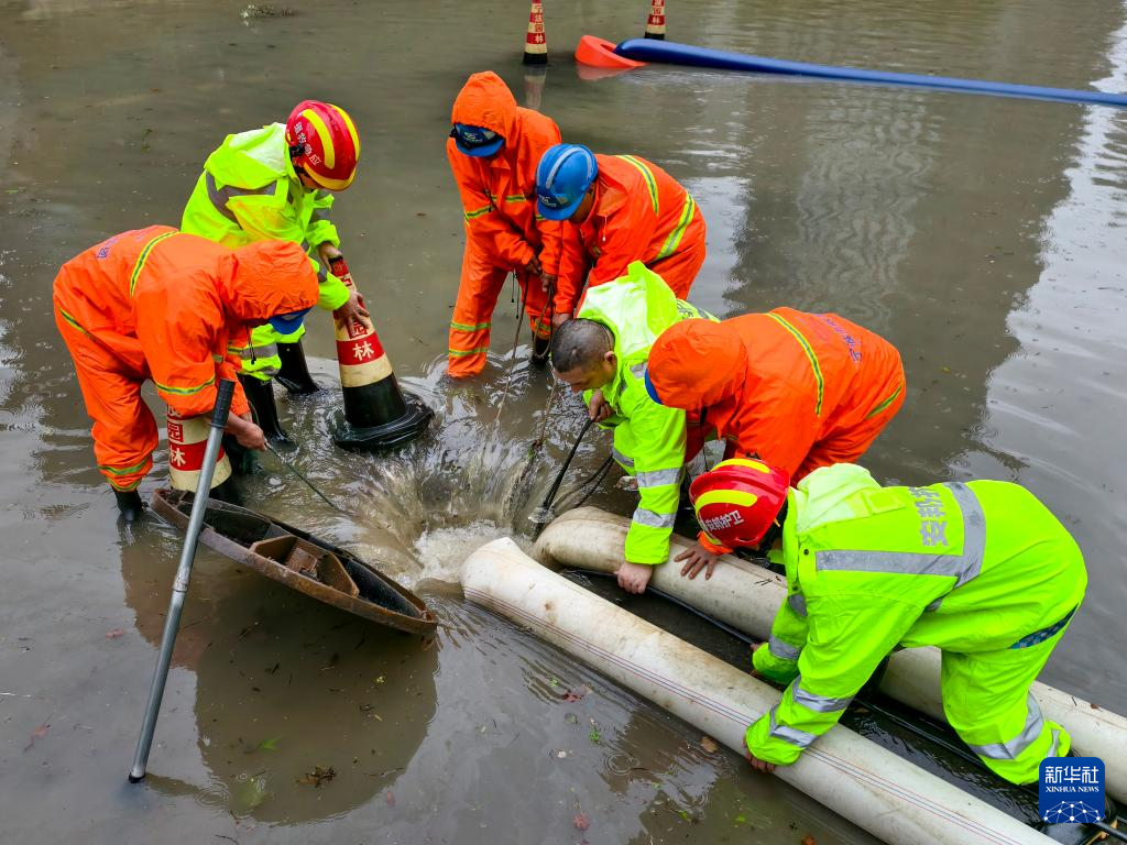 7月30日,浙江省宁波市市政园林等部门救援人员协同排除道路积水。