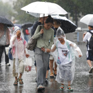 7月30日,工作人员在上海市静安区一地铁口清理积水。