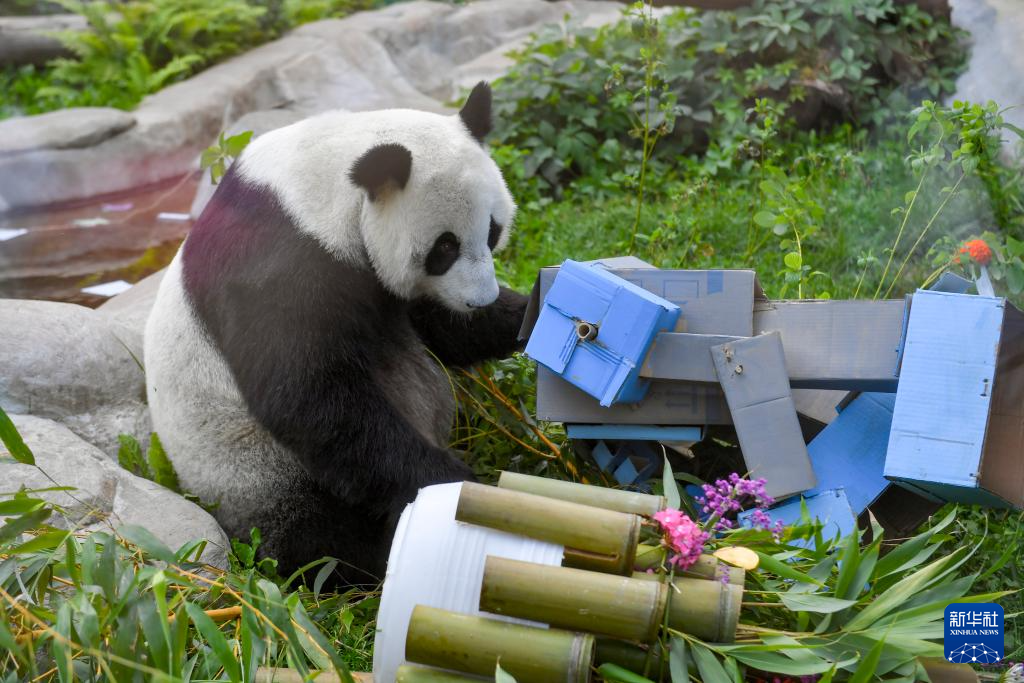 7月30日,在俄罗斯莫斯科动物园,旅俄大熊猫“丁丁”收到生日礼物。