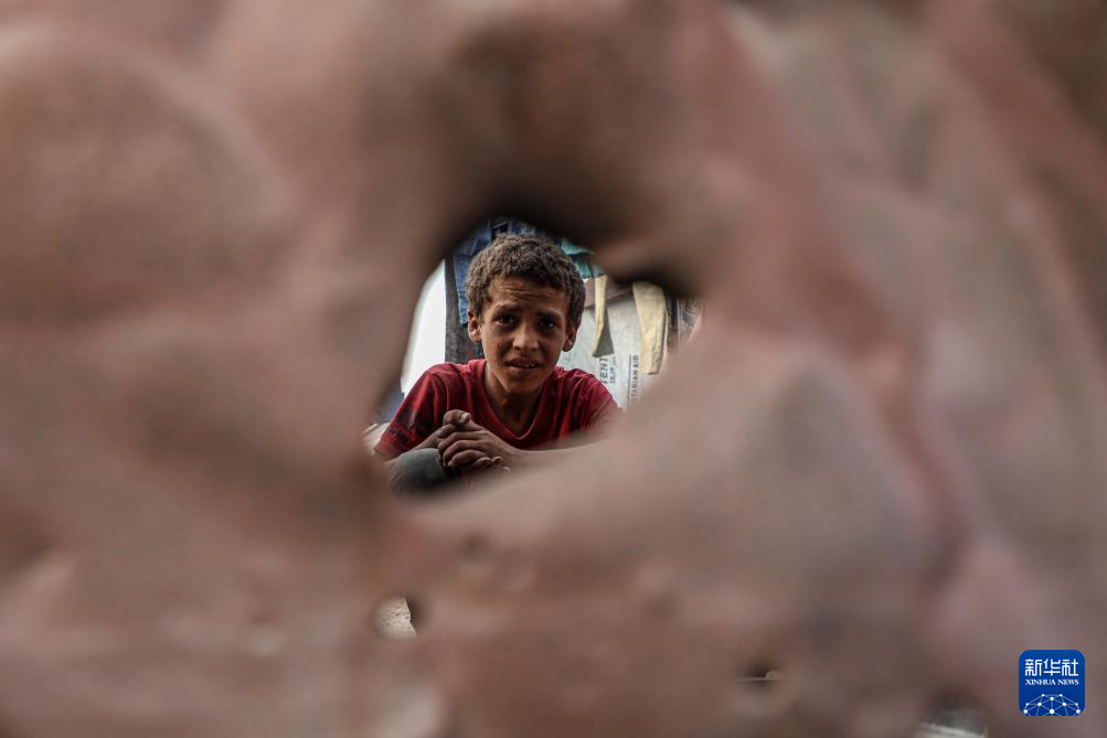 7月29日,在加沙城,一名男孩望向帐篷里。当地许多家庭仅靠少许入境加沙地带的人道援助物资维系生存。