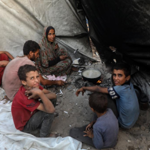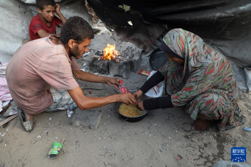 7月29日,在加沙城,一名男子和他的家人在帐篷里做饭。当地许多家庭仅靠少许入境加沙地带的人道援助物资维系生存。