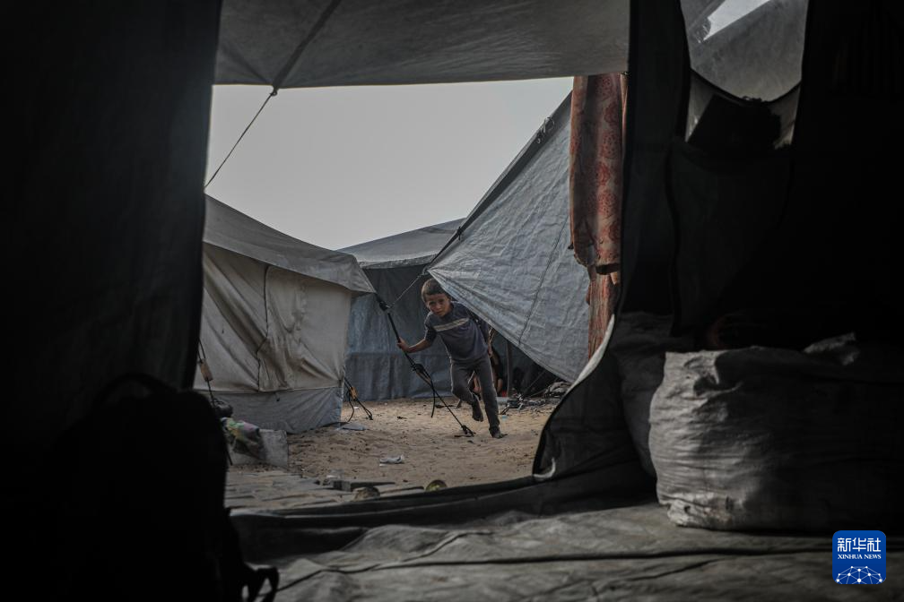 7月29日,在加沙城,一名男孩在帐篷间玩耍。当地许多家庭仅靠少许入境加沙地带的人道援助物资维系生存。