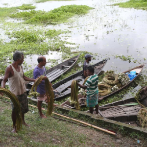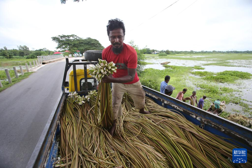7月30日,在孟加拉国达卡,人们将睡莲传递上岸并装车。