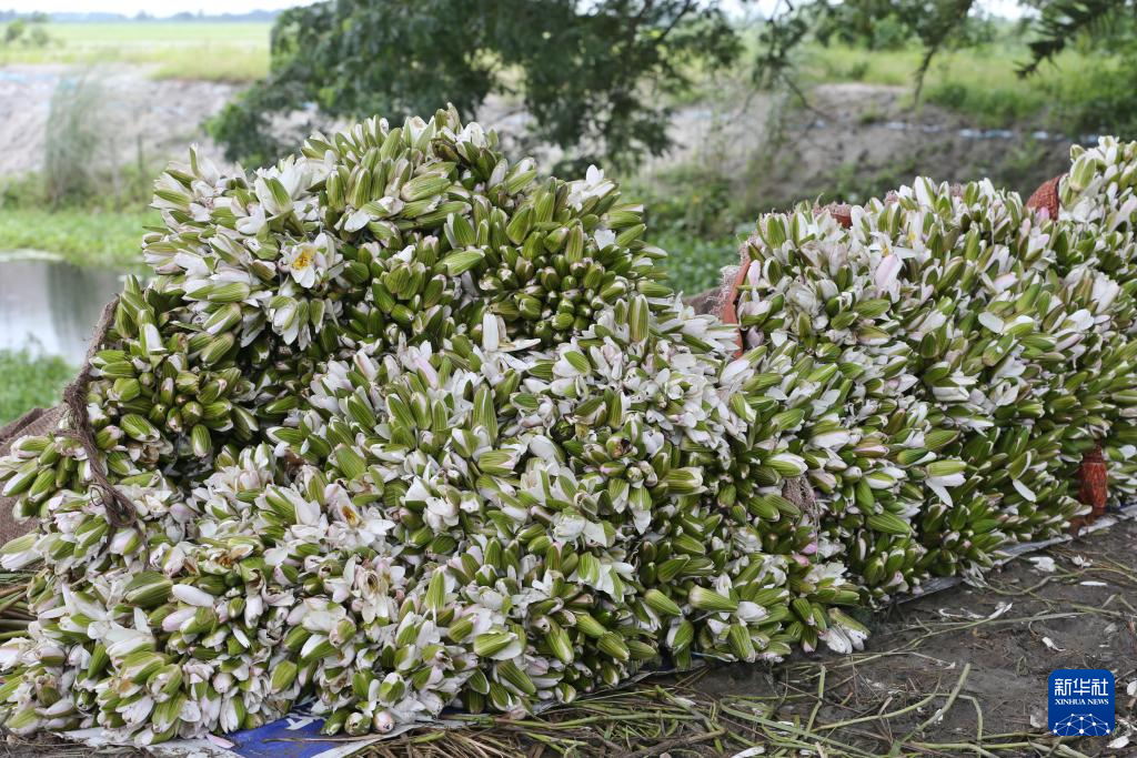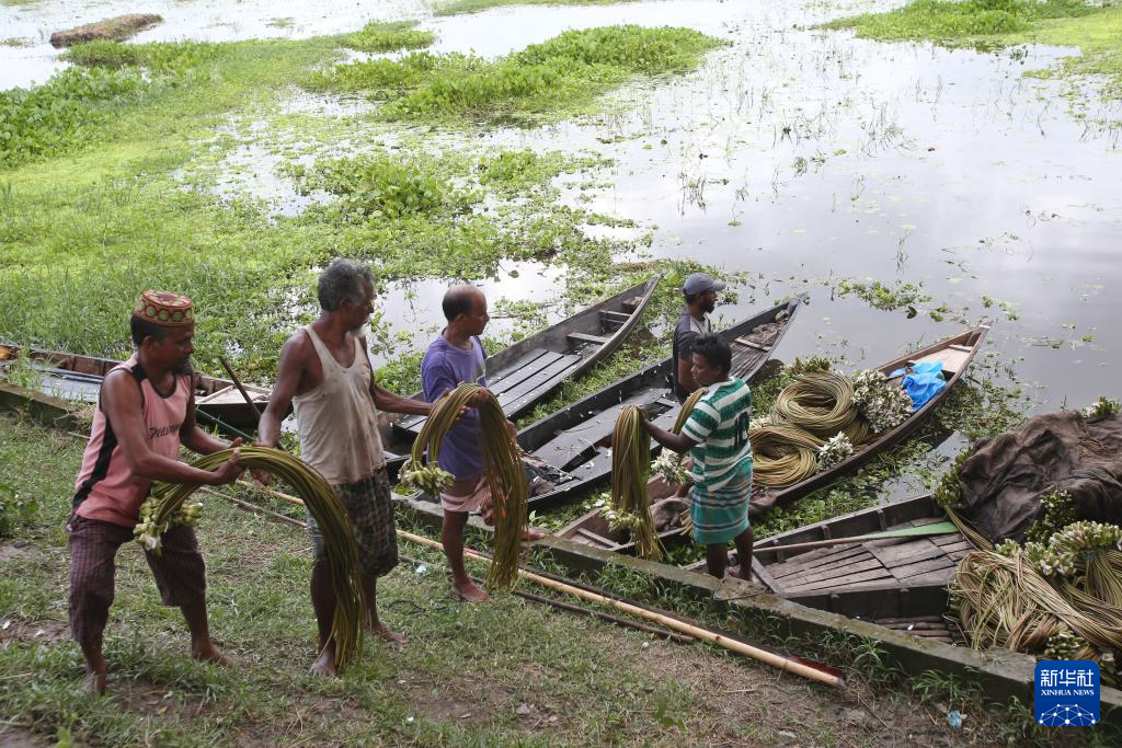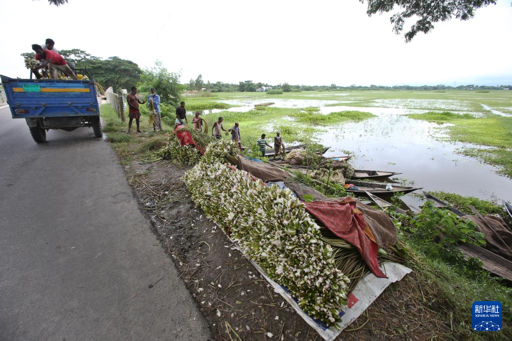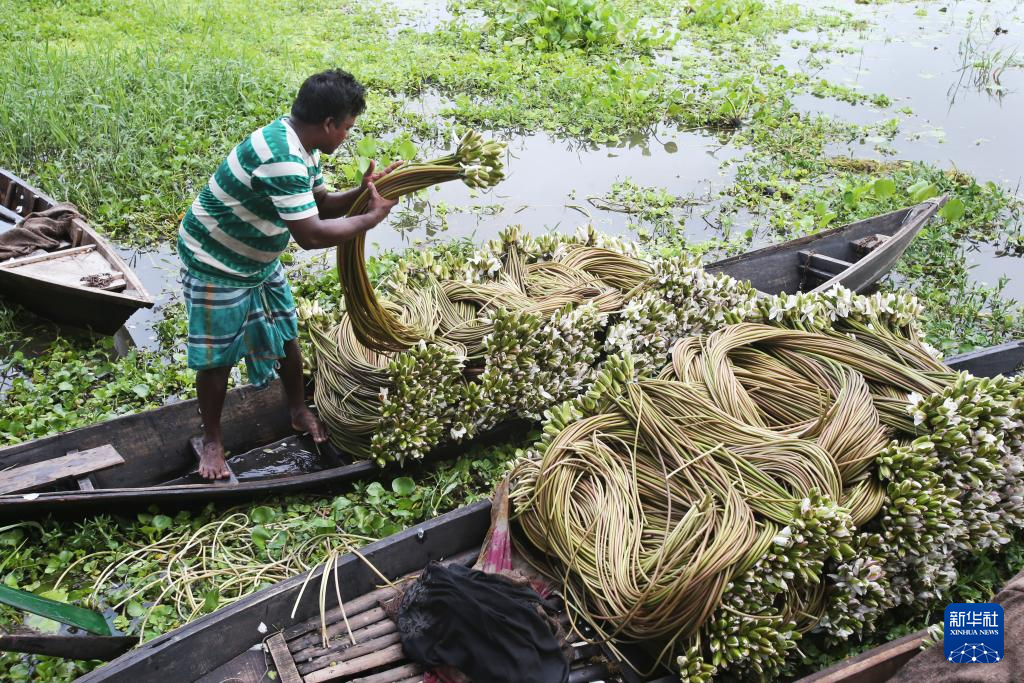 7月30日,在孟加拉国达卡,一名男子整理收获的睡莲。