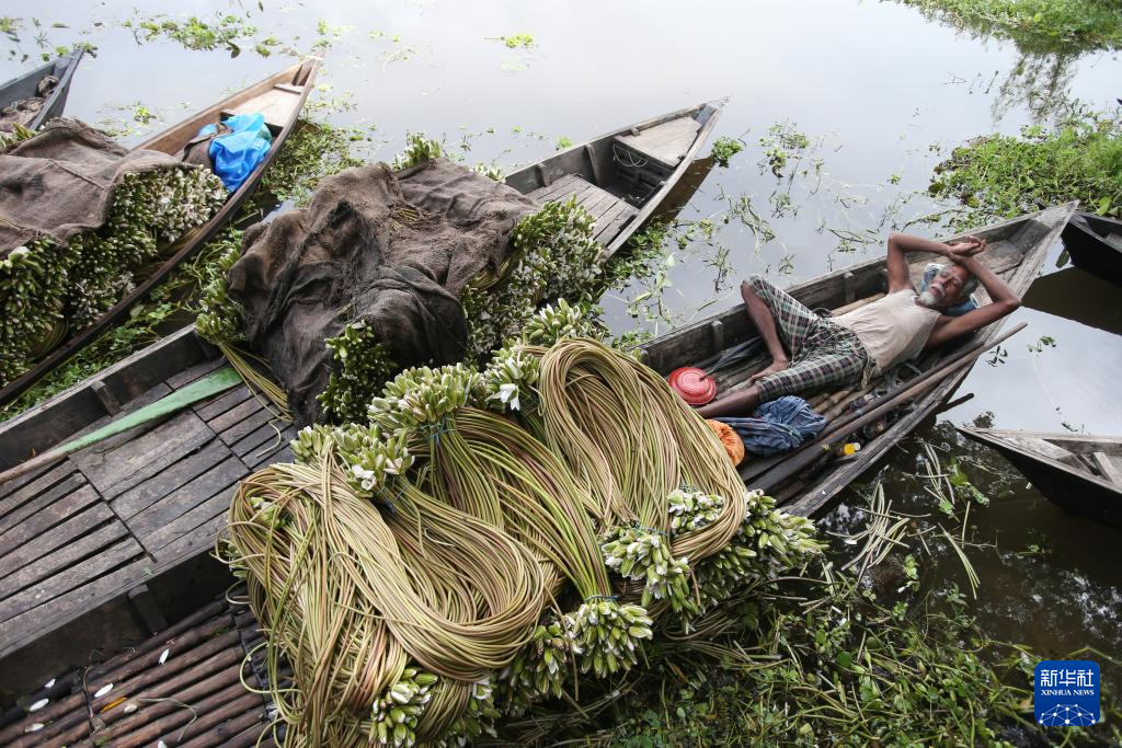 7月30日,在孟加拉国达卡,一名男子在收获的睡莲旁休息。