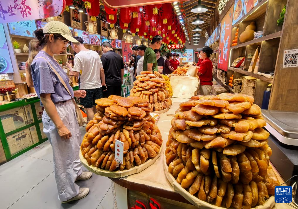 7月30日,游人在什刹海旁的烟袋斜街游览。
