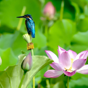 在位于福州市晋安区的晋安湖公园荷花塘里,一只翠鸟停在莲蓬上(6月21日摄)。