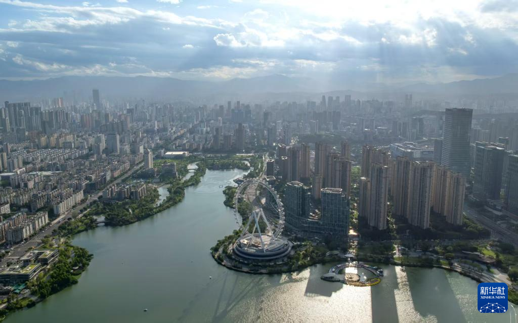 位于福州市晋安区的晋安湖公园沿岸城市风光(7月27日摄,无人机照片)。