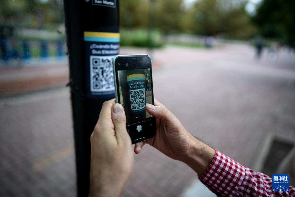 5月7日,乘客在阿根廷布宜诺斯艾利斯街头扫码了解电动公交车运行情况。