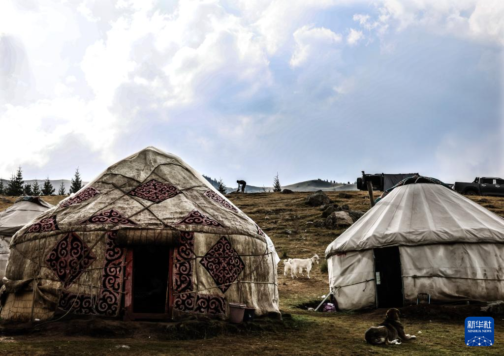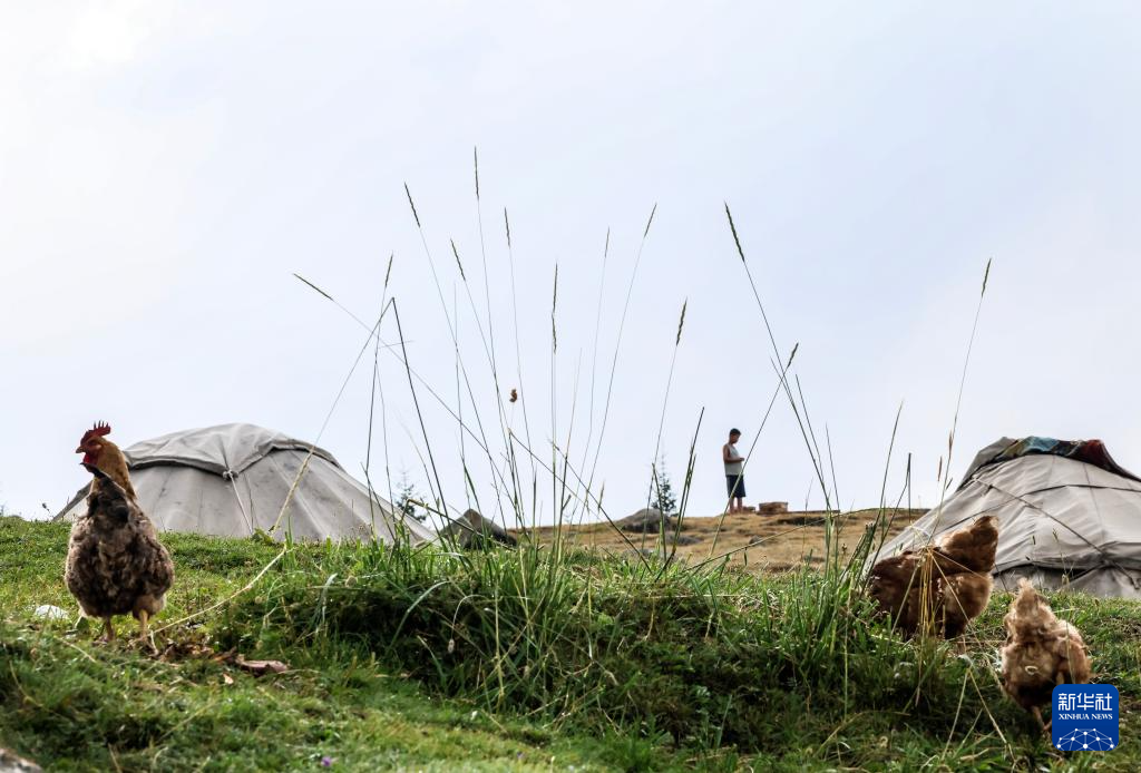 7月29日,一位牧民抱着孩子在毡房门口张望。