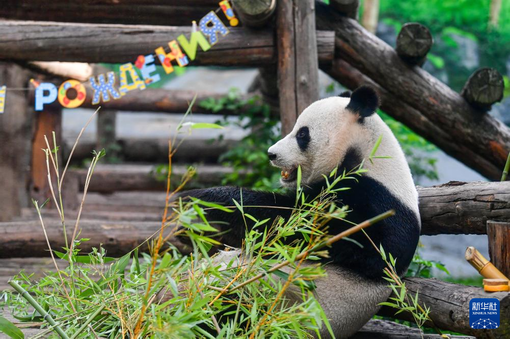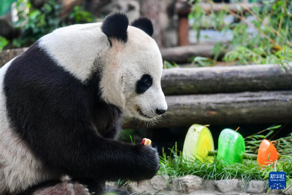 7月31日,在俄罗斯莫斯科动物园,旅俄大熊猫“如意”参加生日庆祝活动。