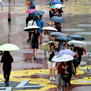 8月2日,人们撑伞走在雨中。