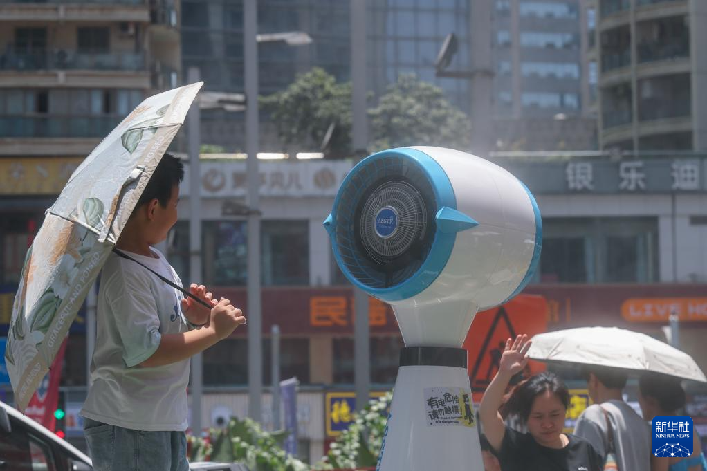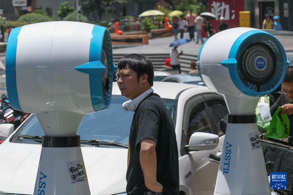 8月2日,重庆市江北区,户外风扇帮助人们降温。