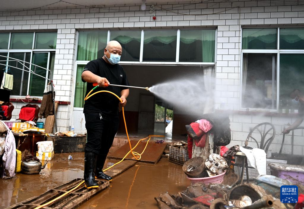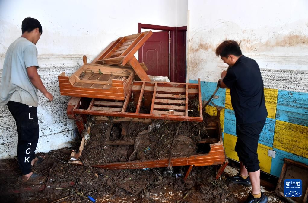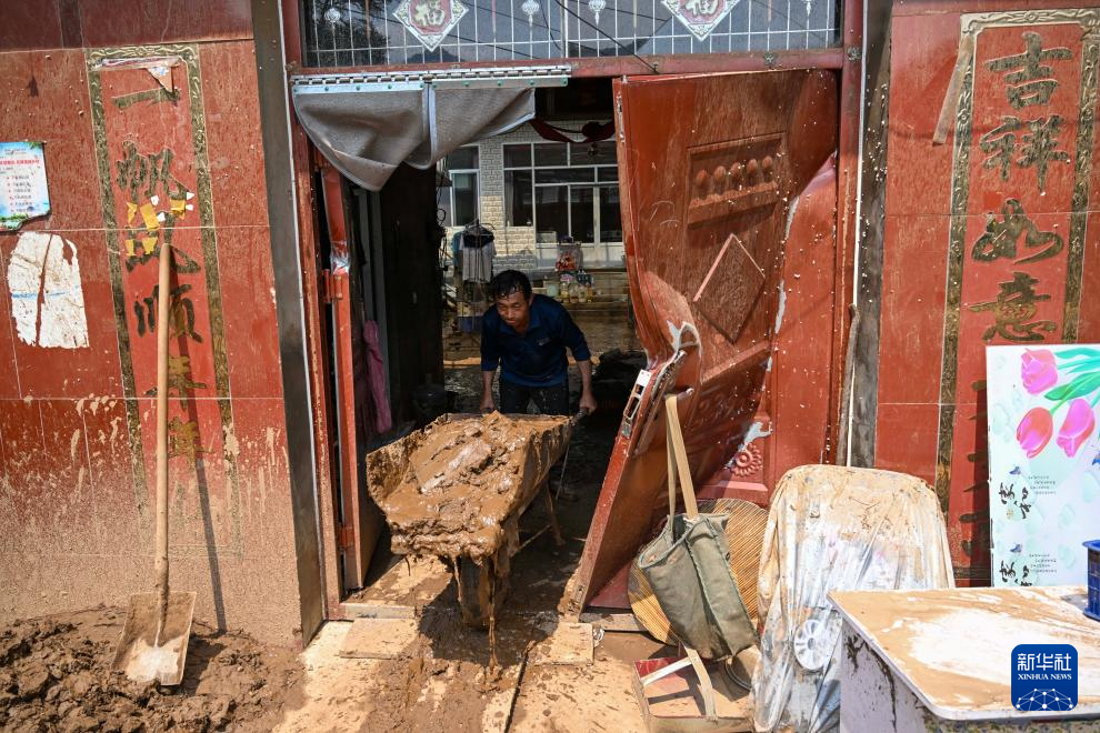 8月1日,在兴隆县六道河镇六道沟村,村民在家中清理淤泥。