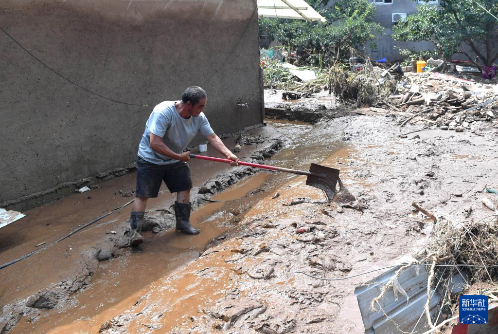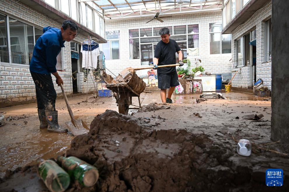 8月1日,在兴隆县六道河镇六道沟村,村民在清理淤泥。