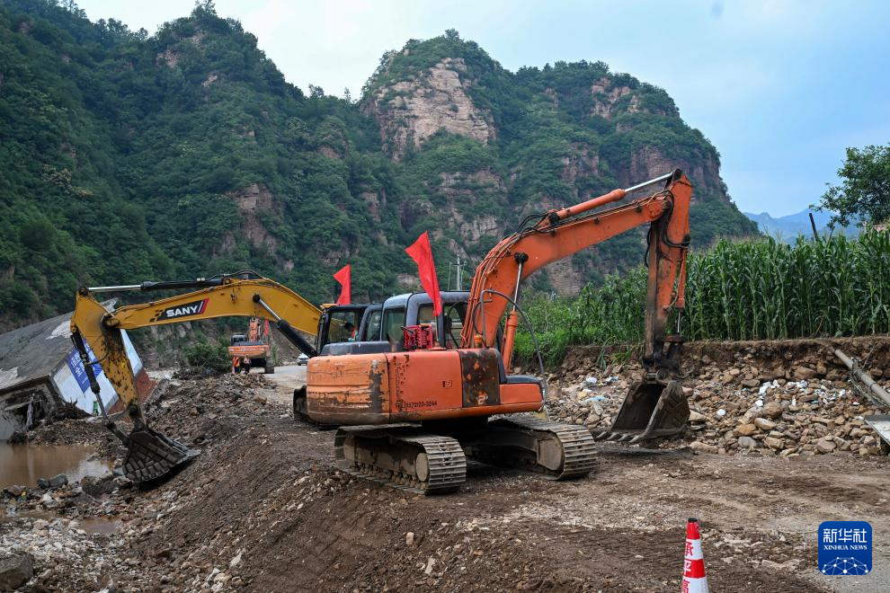 8月2日,在兴隆县六道河镇南台村,工作人员驾驶工程车辆抢修受损的道路。