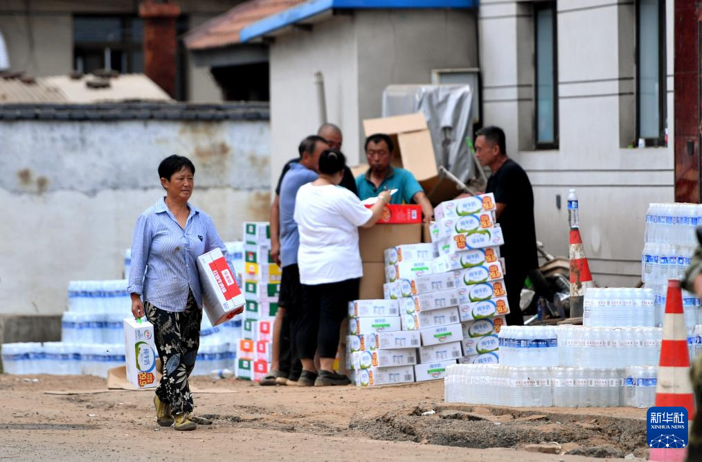 8月2日,在兴隆县六道河镇南台村,村民在领取物资。