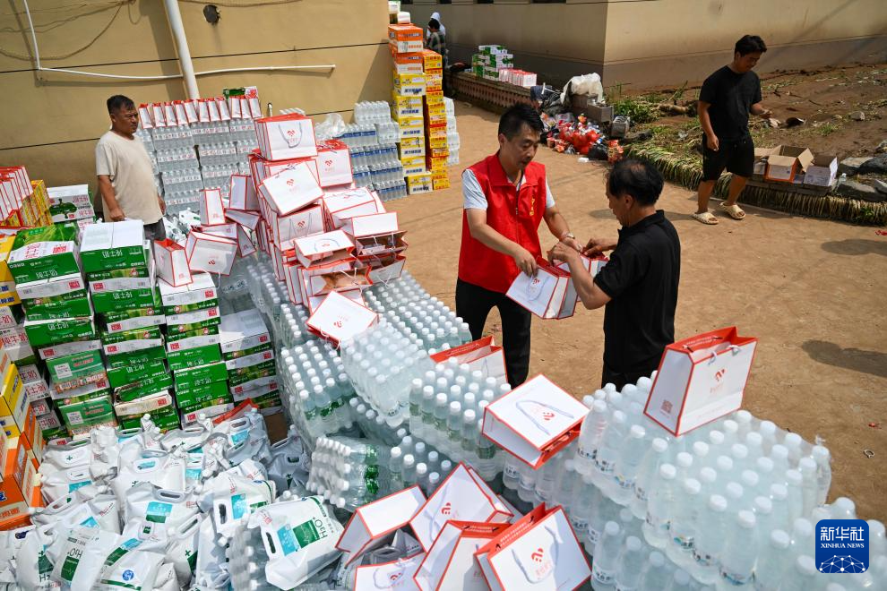 8月1日,在兴隆县六道河镇六道沟村,志愿者为村民发放物资。