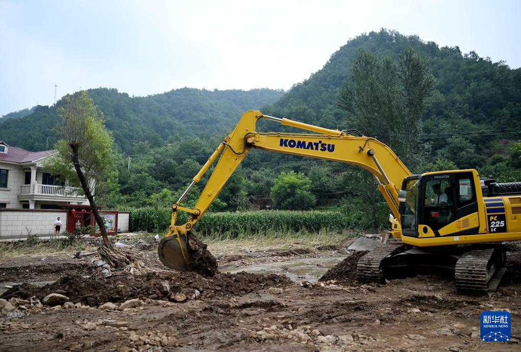 8月1日,在兴隆县六道河镇朱家沟村,工作人员驾驶工程车辆清理石块。