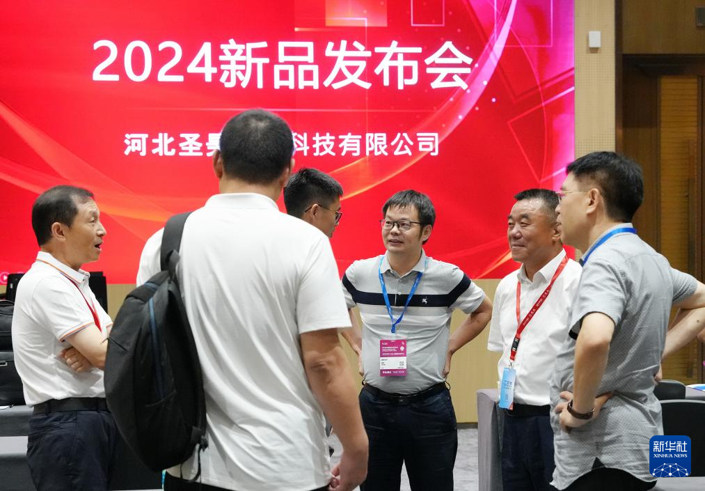 在深圳举行的第二十五届中国国际光电博览会期间,杨勇峰(右二)在公司新品发布会后与嘉宾交流(2024年9月13日摄)。