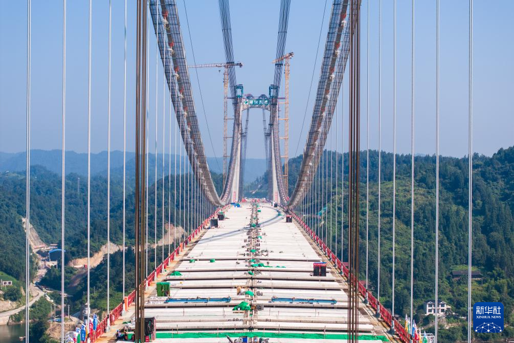 这是8月3日在怀化市沅陵县拍摄的施工中的张官高速洞庭溪沅水特大桥(无人机照片)。
