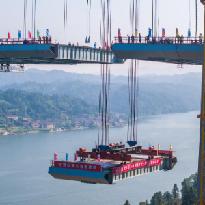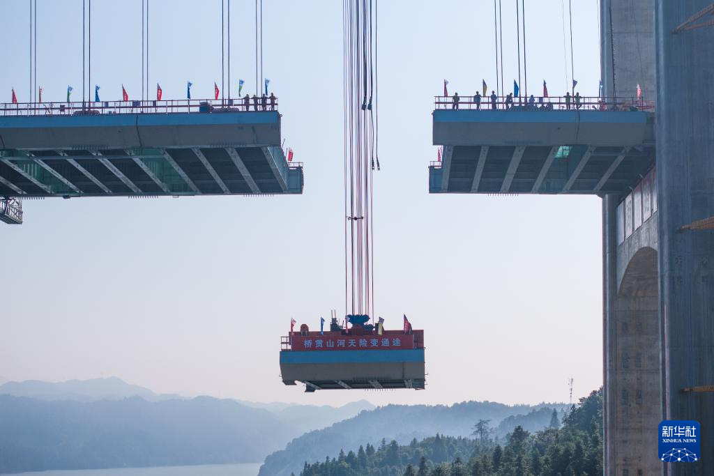 8月3日,在张官高速洞庭溪沅水特大桥施工现场,一块钢混结合梁在被缓缓提升(无人机照片)。