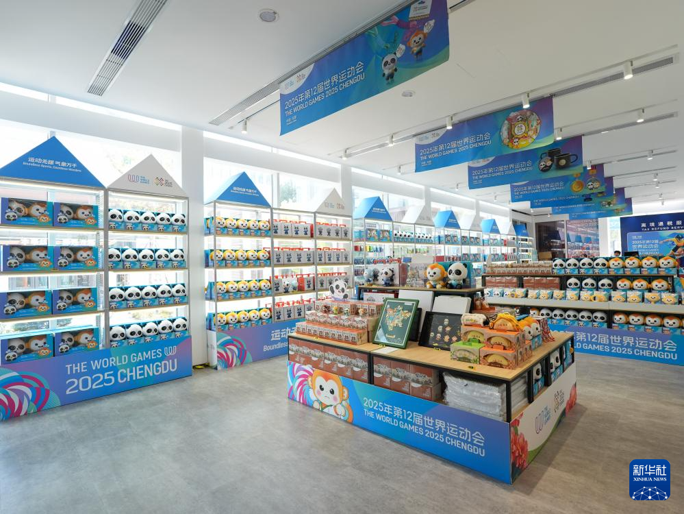 这是8月3日在成都世运会运动员村A区拍摄的官方特许商品零售店内的纪念品。