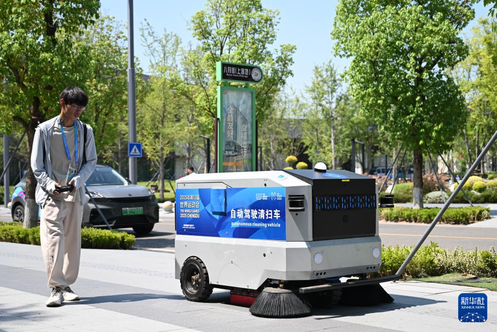 8月3日,在成都世运会运动员村,工作人员引导自动驾驶清扫车前往清扫区域。