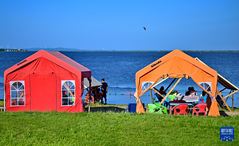 人们在哈尔滨市松花江畔的帐篷中消暑休闲(7月6日摄,无人机照片)。