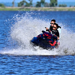 松花江哈尔滨段一处江面,游客在体验摩托艇项目(7月6日摄)。