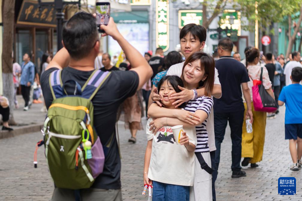 8月1日,游客在哈尔滨市中央大街上留影。